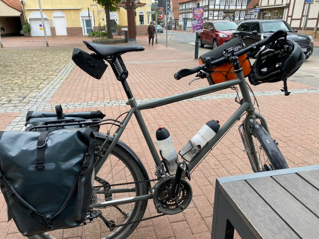 Mein Reiserad stammt aus der Fahrradschmiede "Rotor" aus Leipzig. Es ist ein 26'' Stahlrad - damit man es im Zweifel schweißen kann - und weil Stahl ganz gute Eigenschaften bezüglich Federung mitbringt.