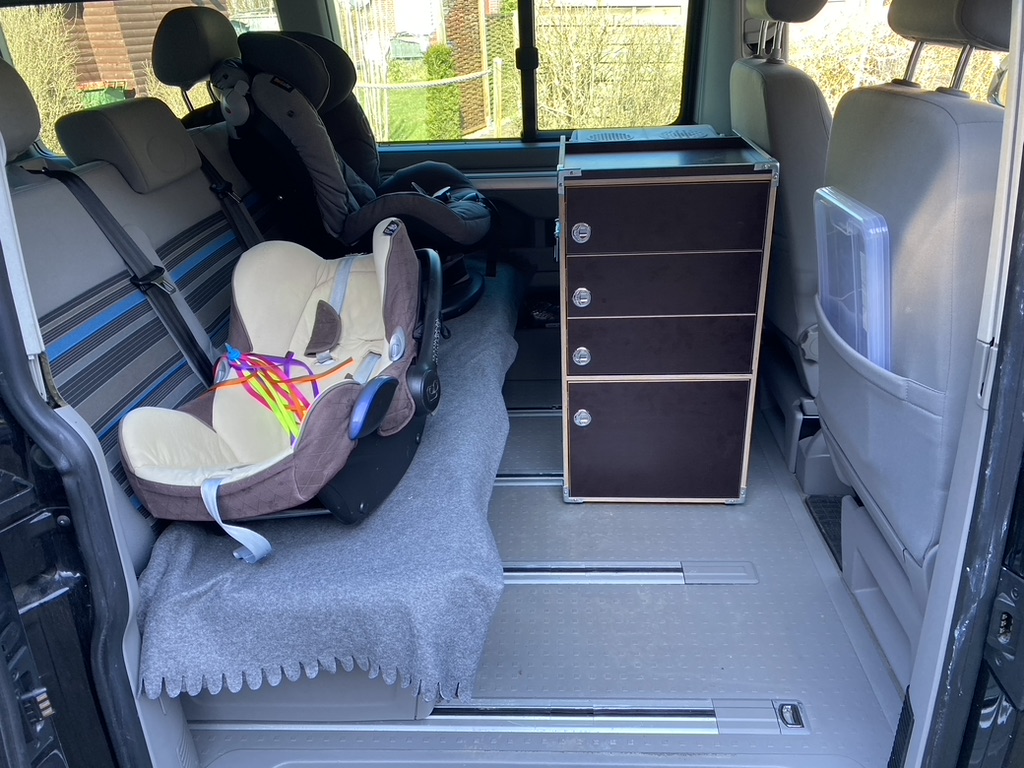 … da wir in der Stadt wohnen und der Bus meist weit weg von unserer Wohnung parkt muss ich die Kiste zum ein- bzw. ausbauen schieben. Ich würde für die paar mal aber beim nochmaligen Bau auf ein Rollbrett zurückgreifen und den Aufwand mit Aussparungen für die Rollen etc. sparen.