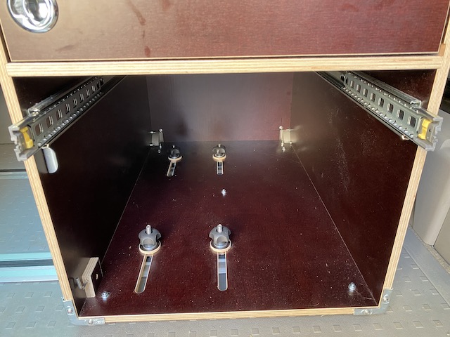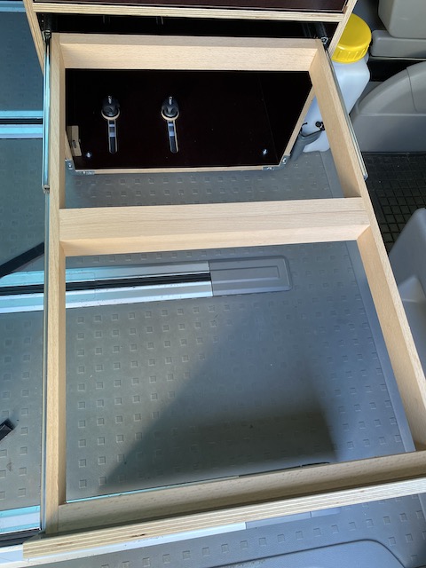 Heute bin ich froh, den etwas aufwendigeren Weg gegangen zu sein: Rahmen zu bauen, in die die SAMLA-Boxen eingesetzt und wieder herausgenommen werden können, und diese Rahmen auf Auszugschienen zu montieren. Das ist sowohl beim Beladen des Busses als auch beim Reinigen der Schubkästen sehr angenehm.