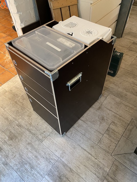 … ist die Kühlbox. Sie ist zwar relativ kompakt und man kommt während der Fahrt an die Inhalte (wenn man hinten bei den Kids sitzt). ABER: sie ist sehr laut. Ideal wäre es, wenn es eine Kompressor-Kühlbox in dem Format (B: 392 H: 450 T: 300) gäbe - bislang habe ich aber noch keine in dem Format gefunden. Und die ganze Kiste jetzt um eine Kompressorkühlbox noch einmal zu bauen lohnt nicht.