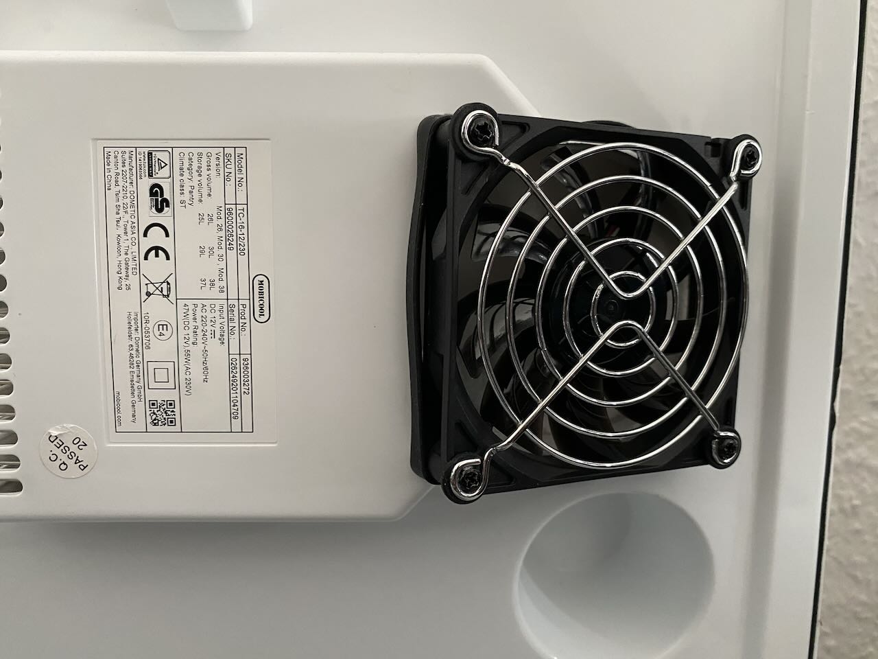 Wie in den Bildern zu sehen, sitzt der neue obere Lüfter außen auf dem Deckel der Kühlbox. Oben quirlt ein 120mm PC-Lüfter die Luft. Strömungsrichtung: nach unten. Damit die Luft ungehindert strömen kann, habe ich (der Dremel leistete gute Dienste) ein (fast) kreisrundes Loch in den Deckel geschnitten. Damit die Luft ihren Weg besser um die Ecke findet, habe ich noch eine „Luftleitpappe“ eingebaut: Eine leere Klorolle wurde geviertelt und die 90° Rundung so (mit Augenmaß) zugeschnitten, dass diese in die Form des ehemaligen obigen Radiallüfters passt. Fixiert mit Heißkleber. Tut, was es soll und macht einen fühlbaren Unterschied (fühlbar am Abwärmeauslass). Dann kurz Löcher bohren und der neue Lüfter inklusive eines Lüftergitter kann montiert werden. Das Lüftergitter ist in meinem Fall (kleine Kinder) sicher angebracht und auch ohne kleine Kinder rate ich dazu, gerade bei dem Standort der Kühlbox im Bus kann da auch sonst mal eine Klamotte oder was weiß ich drauf landen. Die Silikoneinsätze für die Schrauben nicht vergessen (sollte sich der/die geneigte NachbauerIn auch für einen Noiseblocker Lüfter entscheiden, sonst nicht…), die sorgen für eine Geräuschentkopplung zum Gehäuse - das macht auch nochmal ein paar Dezibel.